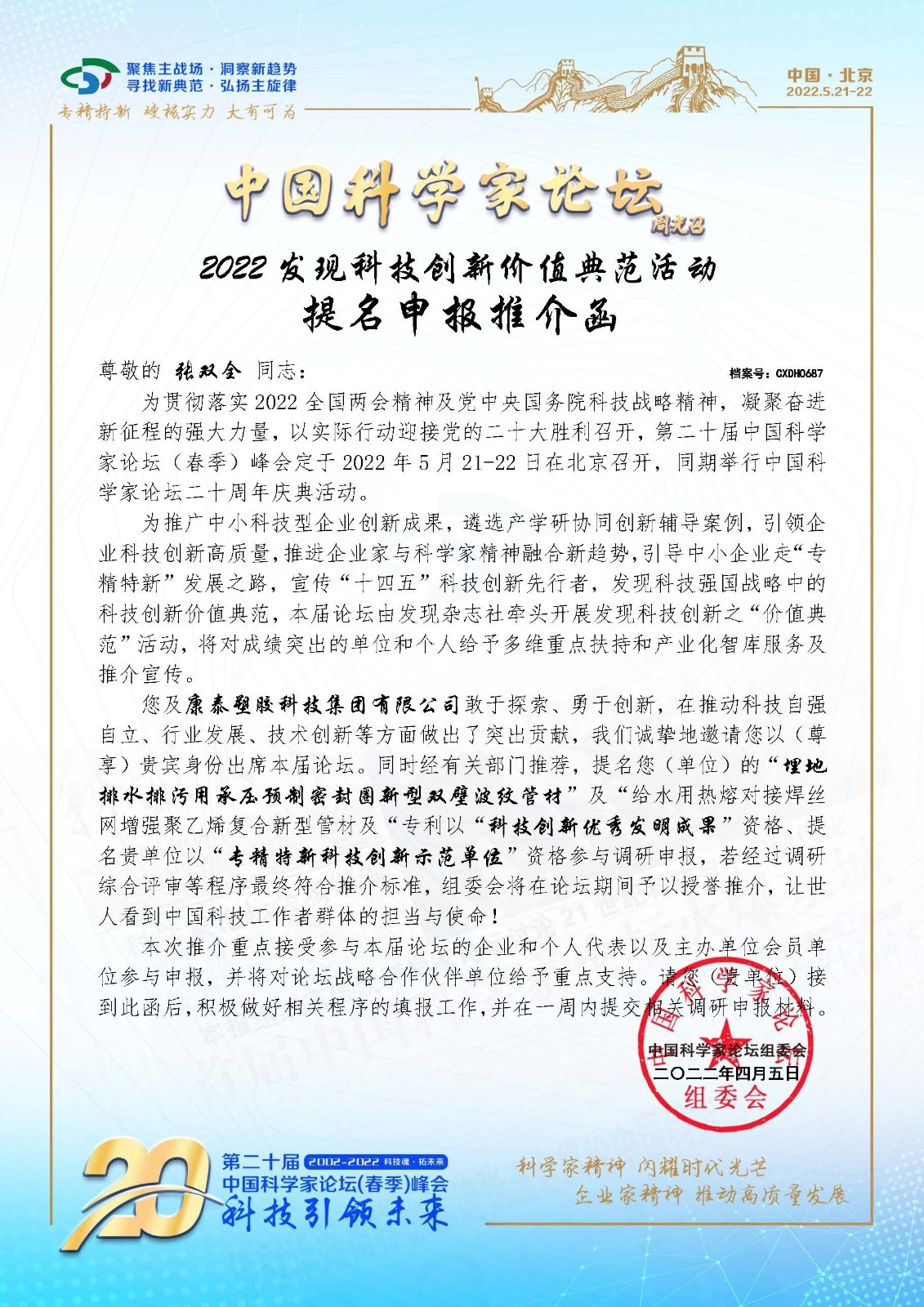 5月21日康泰集團(tuán)總工程師兼技術(shù)總監(jiān)張雙全應(yīng)邀參加了“第二十屆中國科學(xué)家論壇線上會議”。張總詳細(xì)介紹了企業(yè)的基本情況,重點介紹了集團(tuán)差異化產(chǎn)品。通過線上會議有效宣傳、推介了康泰集團(tuán)差異化產(chǎn)品,傳播了康泰品牌。